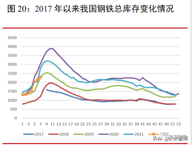 根据百川盈孚的数据,截止 2022 年 2 月 18 日,我国钢铁总库存为 2300.08 万吨, 相比 2021 年同期下降 17.53%,相比 2020 年同期下降 24.43%。库存低于过去两年同期 水平。年初以来的钢铁低库存对应的是钢价的温和上涨,截止 2 月 23 日,普钢价格综 合指数相比年初上涨了 3.68%。