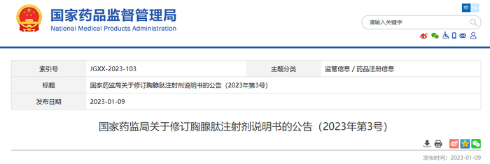 国家药监局关于修订胸腺肽注射剂说明书的公告(2023年第3号)