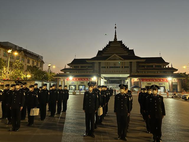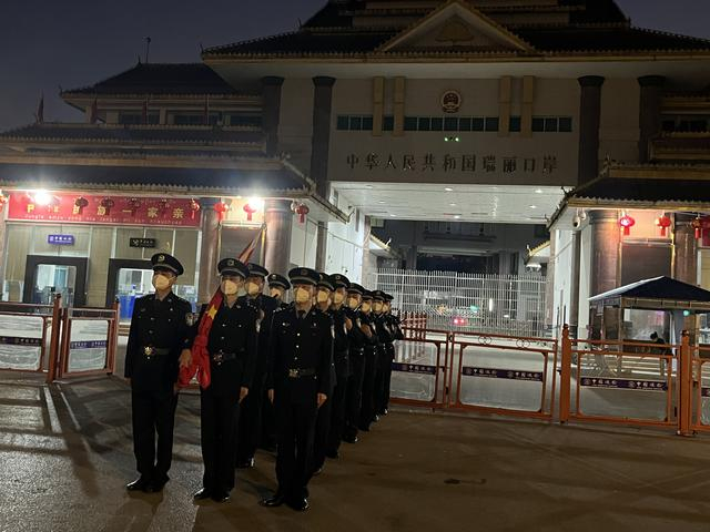1月8日早晨7点30分,天边翻出鱼肚白时,瑞丽出入境边防检查站的民警们在国门前举行了升旗仪式,使开放国门的过程更显庄重。早晨8点,随着边检站站长对口岸各岗位民警统一下达开关指令,瑞丽口岸各出入境通道同时打开,昭示着因疫情已关闭了1012天的姐告国门恢复通关,准备迎接中缅两国间往来的人们。