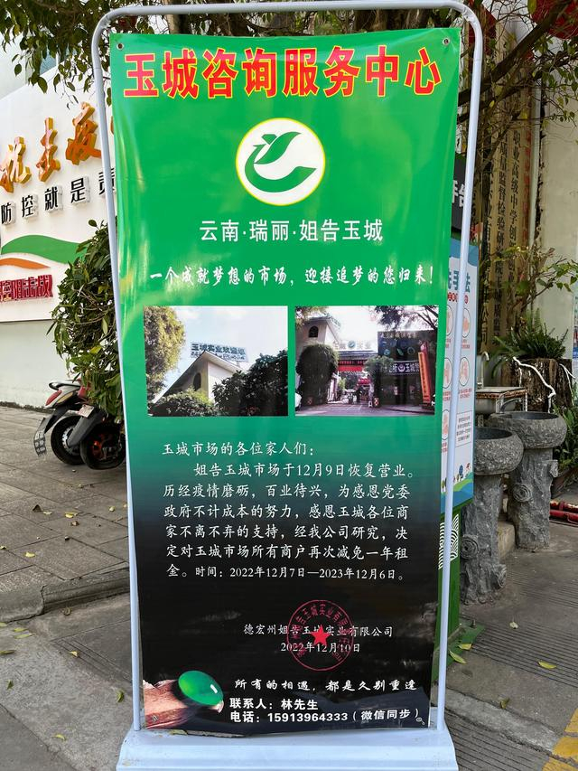 在当地政府努力招商引资,希望玉石商人回归的同时,当地企业也在努力。此前关闭的姐告玉城,在获悉国门开放的消息后,着手完成了电路、网络、灯光和屋顶防水工程的检修,号召商家们回归。姐告玉城还在门口的海报上打出了继续免租一年(2022年12月7日至2023年12月6日)的广告。