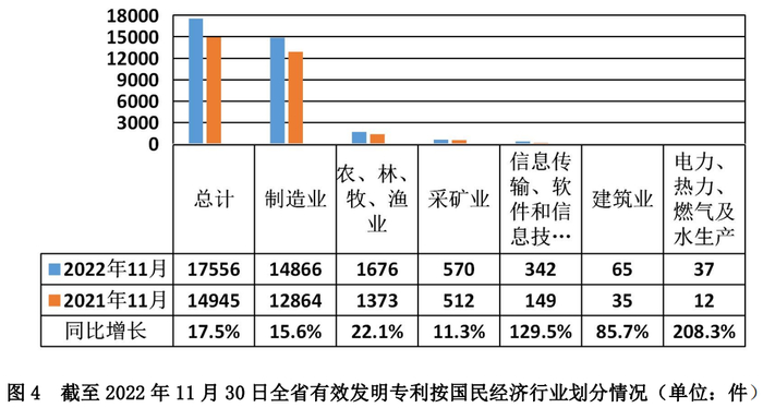 按国民经济行业(门类)划分。制造业1.48万余件,占全省有效发明专利84.7%;农、林、牧、渔业1676件,占全省有效发明专利9.5%;采矿业570件,占全省有效发明专利3.2%;信息传输、软件和信息技术服务业342件,占全省有效发明专利1.9%;建筑业65件,占全省有效发明专利0.4%;电力、热力、燃气及水生产和供应业37件,占全省有效发明专利0.2%。