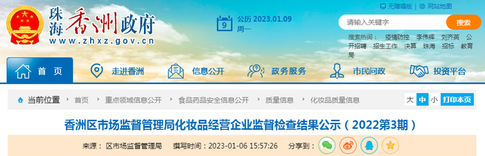 珠海市香洲区市场监管局化妆品经营企业监督检查结果公示(2022第3期)