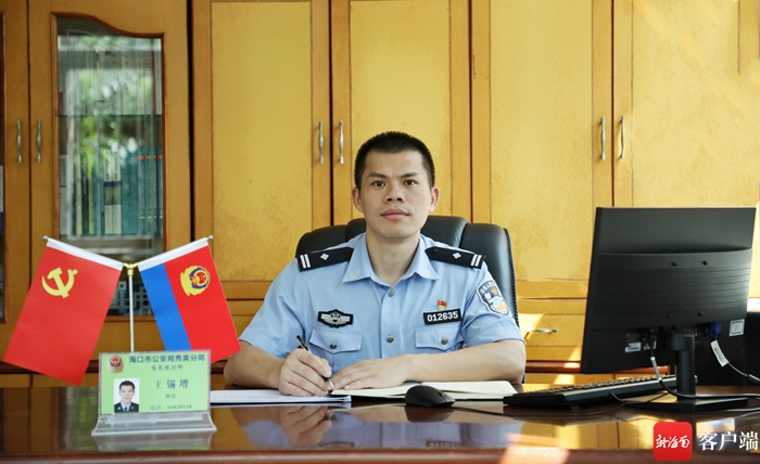 王锡增留着寸头,体格健硕、孔武有力、目光如炬,在海口市公安局秀英分局干刑警的12年,他参与了每一起重大案件的侦办。来到秀英派出所的两年多里,他没有请过一天公休。“破案时的想法很单纯,就是为了惩恶扬善;成为一名基层民警后,直面老百姓,对公安职业有了更深感触……”他总觉得为人民服务绝不能讲“虚”。