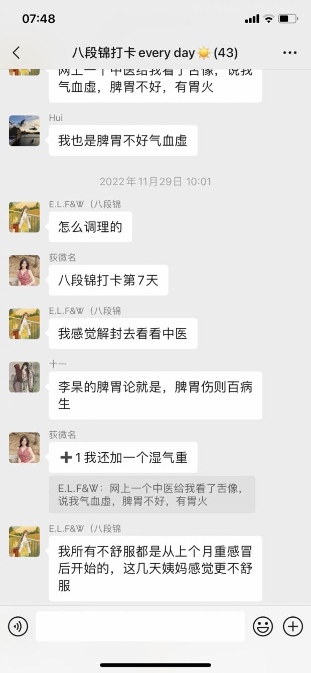 打卡群里基本都是95后的女生,还有几位00后,平均年龄在二十四五岁。除了每天固定的八段锦打卡,这群女孩还会在群里交流自己开始练习八段锦的原因,基本情况和吉岛相似,身体畏寒,有胃病或睡眠不好、免疫力差等问题。她们都是年纪轻轻就开始被一些小毛病缠身,便想通过不同的途径增强自身免疫力,八段锦成为了她们最终的选择。