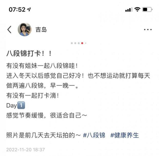 2022年11月的一个清晨,吉岛起了个大早,来到公园找了一张长椅,把自己的保温杯放好,手机靠在椅背上,播放起昨晚在b站找到的八段锦视频,开始一招一式地学习起来,虽然刚开始感觉有点费力,但她还是坚持了12分钟。