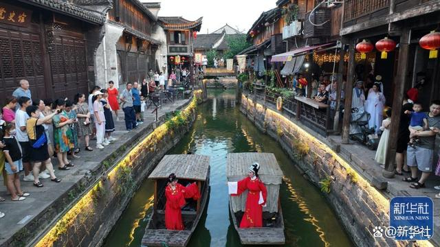 ↑2022年7月10日,在浙江省湖州市德清县新市古镇“戏曲夜市”上,演员为群众表演传统戏曲曲目(无人机照片)。新华社发(谢尚国 摄)