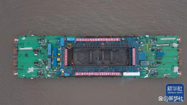 ↑2022年11月21日清晨拍摄的“奋力”轮“怀抱”古船的画面(无人机照片)。采用世界首创的“弧形梁非接触文物整体迁移技术”, 我国迄今水下考古发现的体量最大的木质沉船——长江口二号古船21日在长江口水域成功实施整体打捞。随着打捞进展有序推进,21日清晨,长江口二号古船船体已局部露出水面,初露真容。新华社记者 金立旺 摄