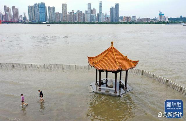 ↑2022年6月11日,两名市民离开湖北武汉武昌区江滩黄花矶凉亭(无人机照片)。长江武汉段水位多日持续上涨,逼近武汉长江防汛25米设防水位。新华社发(赵军 摄)