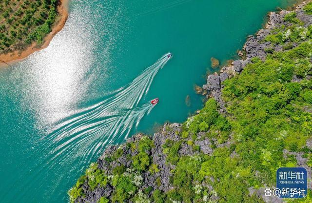 ↑2022年4月21日,在湖南省永州市道县寿雁镇乐海水库,护水志愿者乘坐快艇进行水上巡查作业(无人机照片)。4月22日是世界地球日。近年来,越来越多人用实际行动来保护环境,珍爱地球。新华社发(蒋克青 摄)