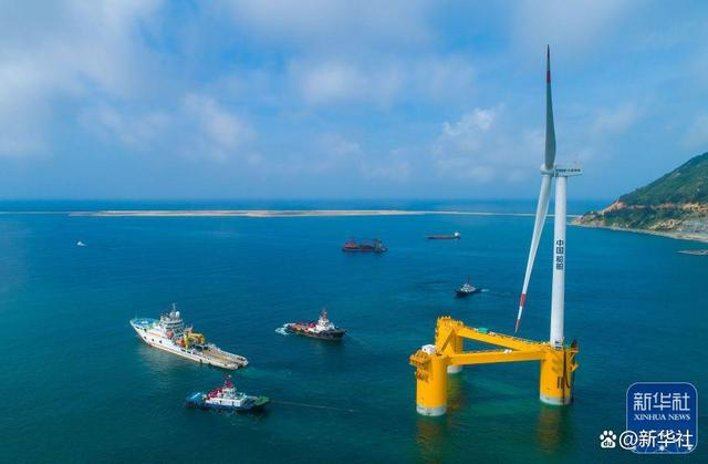 ↑2022年5月29日,国内首台深远海浮式风电装备“扶摇号”从广东省茂名市广港码头拖航前往罗斗沙海域进行示范应用(无人机照片)。新华社记者 刘大伟 摄