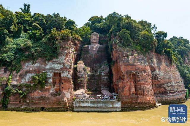 ↑这是2022年8月23日拍摄的露出底座的乐山大佛(无人机照片)。持续高温晴热天气使四川省多地出现不同程度的旱情,长江上游的主要支流岷江、青衣江和大渡河三条水系的上游来水均少于往年同期,导致乐山大佛前方的三江汇流处水位持续降低,部分河床与江滩裸露,乐山大佛罕见露出底座。新华社记者 沈伯韩 摄