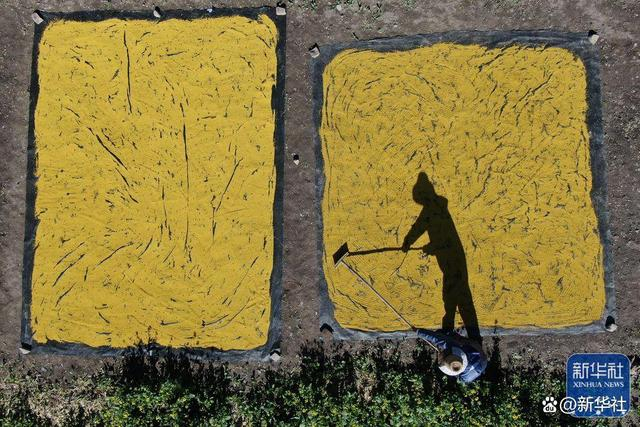 ↑2022年7月3日,在青海省海北藏族自治州门源回族自治县,来自四川德阳的蜂农冯跃宣在晾晒花粉(无人机照片)。新华社记者 张龙 摄