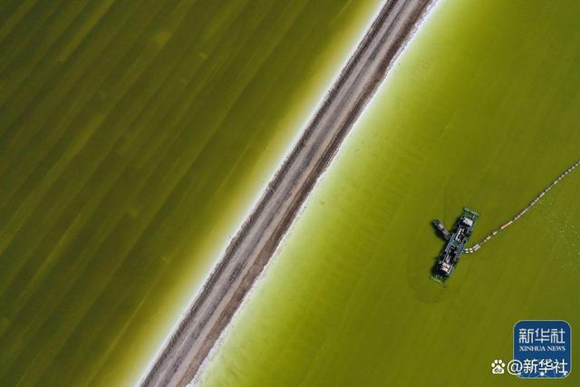 ↑2022年4月1日,采盐船在青海盐湖工业股份有限公司钾肥分公司的盐湖工作(无人机照片)。每年3月至4月是春耕备耕关键期,青海盐湖工业股份有限公司钾肥分公司的各条生产线满负荷生产,助力春耕备耕。新华社记者 张龙 摄