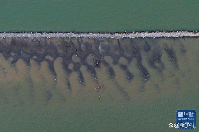 ↑2022年7月3日,环卫工作人员在山东省青岛市崂山区石老人海水浴场海滩上清理浒苔(无人机照片)。新华社记者 李紫恒 摄