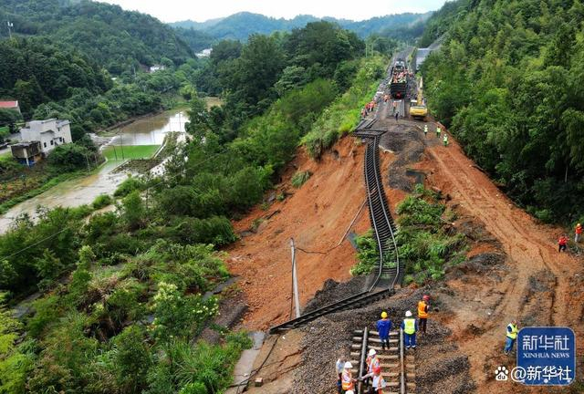 ↑2022年6月14日,在位于龙岩市长汀县的赣龙线金峰山站至长汀站区间路堤塌陷现场,铁路部门组织抢险修复水害地段(无人机照片)。福建多地连日出现持续强降雨,位于闽西的龙岩市遭遇多轮局地性、突发性极端暴雨天气,造成不同程度受灾。新华社记者 魏培全 摄