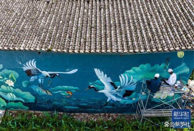 ↑2022年6月24日,“95后”公益墙绘师刘志诚(右)在云南省丽江市永胜县三川镇进行墙绘创作(无人机照片)。他在家乡程海镇、三川镇的多个村子里画了20多幅不同主题的墙绘,给村庄增添了斑斓色彩,吸引了不少游客前来“打卡”。新华社记者 江文耀 摄