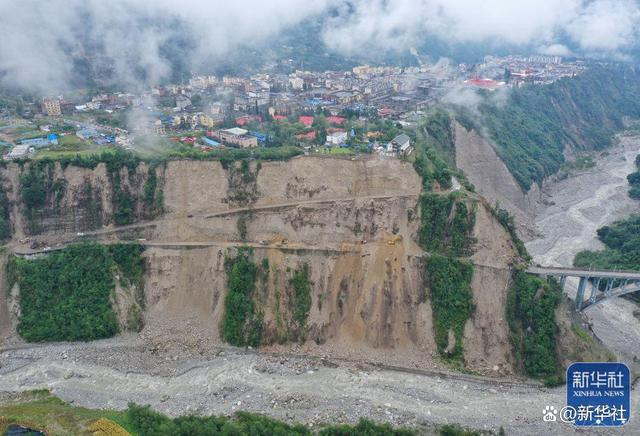 ↑2022年9月9日,抢险人员在抢通磨西镇附近道路(无人机照片)。四川泸定磨西镇出现降雨,加大了灾区道路抢通抢险难度。新华社记者 刘坤 摄
