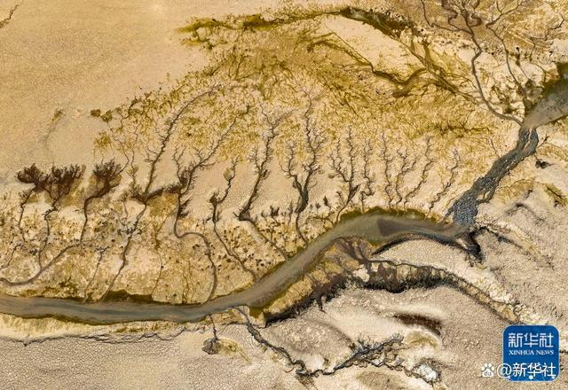 ↑这是2022年7月9日在河南省济源市境内拍摄的黄河小浪底库区的“沙画”(无人机照片)。随着黄河小浪底水利枢纽汛前调水调沙的结束,黄河小浪底库区水位下降,大面积河床裸露出水面,河水在河床上冲刷留下的痕迹形成黄河“沙画”。新华社发(苗秋闹 摄)