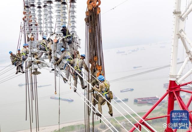 ↑2022年3月13日,在安徽芜湖的长江边,安徽送变电工程有限公司施工人员在高空进行特高压输电线路跨江作业(无人机照片)。3月14日,白鹤滩—江苏±800千伏特高压直流输电工程安徽段跨越长江放线工程完成最后6根导线的展放,标志着特高压“白江线”安徽段长江大跨越线路贯通。新华社记者 周牧 摄