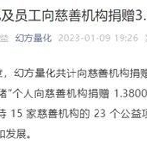 幻方称,2022 年度,幻方量化共计向慈善机构捐赠 2.2138 亿元。除此以外,公司员工“一只平凡的小猪”个人向慈善机构捐赠 1.3800 亿元。以上合计 3.5938 亿元均已完成打款,将支持 15 家慈善机构的 23 个公益项目,在全国范围内帮助弱势群体,促进社会的公平和发展。