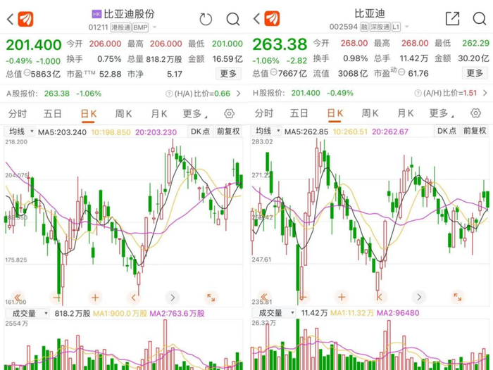 截至1月9日,比亚迪H股报收201.4港元/股,A股报收263.38元/股,合计总市值约6709亿元。