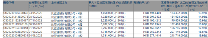 2022年12月8日,减持132.95万股比亚迪H股,均价201.3432港元/股。