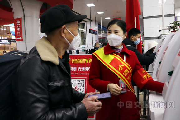 陕西省西安市纺织城客运站“小酒窝”志愿者引导乘客购票。