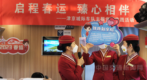 春运首日,津京城际车队在C2023次列车上为旅客解读铁路新规常识。