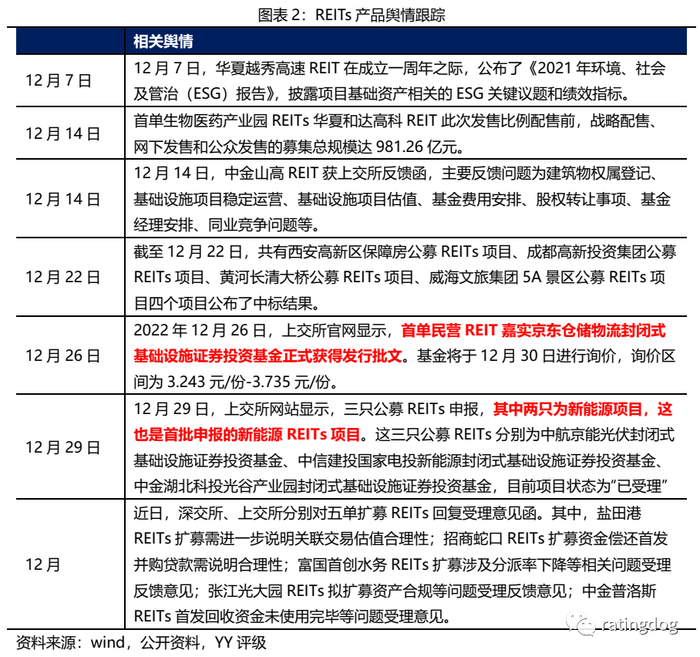 十二月舆情跟踪:年底REITs项目进入密集申报期,两单新能源REITS报至上交所,C-REITS即将迎来新资产类型,另有首单民企仓储物流REITs获批。后续市场底层资产以及发行人多样性将有望继续拓宽,为投资者分散配置提供机会。