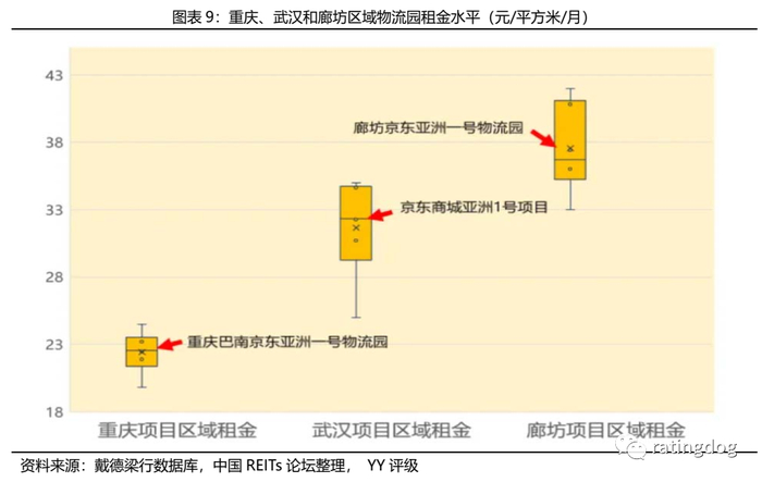 租金表现及增长率:重庆项目、武汉项目2019年-2022年历史合同租金平均增长率为3%,廊坊项目自2020年4月开始运营,2020年-2022年历史租金平均长率为3%。从目前的单月租金水平来看,重庆项目为 22.53 元/平方米,武汉为 32.40 元/平方米,廊坊为36.05 元/平方米,均为所在区域同类资产的中偏上水平。