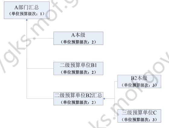 答:根据编制说明,一级预算单位有下一级预算单位的,其本级代码填“2”;没有下一级预算单位的,代码填“1”。例如,A部门由部门本级、2个二级预算单位和1个三级预算单位组成,其单位预算级次填报如下:
