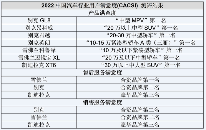 近日,中国质量协会公布了2022年中国汽车用户满意度测评(CACSI)结果,上汽通用汽车取得出色成绩。在“产品满意度”方面,别克GL8、昂科威、君越、英朗以及雪佛兰科鲁泽、迈锐宝XL、凯迪拉克XT6共7款车型分别摘得各细分市场冠军;在“售后服务满意度”方面,雪佛兰与别克获得合资品牌前两名,凯迪拉克位列豪华品牌第三名;在“销售服务满意度”评测中,别克与雪佛兰并列合资品牌第二名,凯迪拉克获豪华品牌类别第三名。