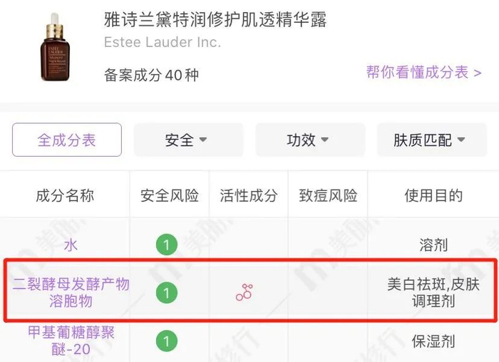 雅诗兰黛小棕瓶就添加了高浓度二裂酵母发酵产物溶胞物 + 酵母提取物 + 乳酸杆菌发酵物。
