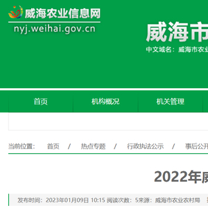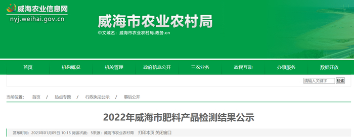 中国质量新闻网讯 2023年1月9日,山东省威海市农业农村局网站公示2022年威海市肥料产品检测结果。
