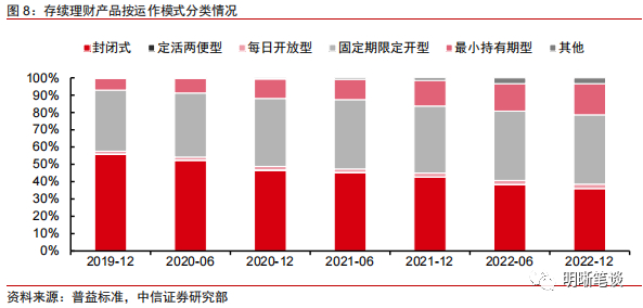 由于定开式产品滚动存续方便,也有利于形成品牌效应等优势,此前理财公司更青睐发行定开式产品。定期开放型理财具有较强的流动性,产品期限被分为一个个周期,每个周期均可在固定的赎回开放日内赎回,其余时间内不可操作赎回,若在一个周期内未赎回,则自动进入下一周期,滚动存续较为方便;且若产品上一期兑付收益较好,可以吸引更多投资者,有利于其下一期募集,形成品牌效应。因此此前理财公司更青睐发行定开型理财产品,根据普益标准数据显示,封闭式产品和固定期限定开型产品一直是理财市场存续占比最高的两类产品,固定期限定开型产品在2022年12月底存续产品数量为27696只,占比达到40%。