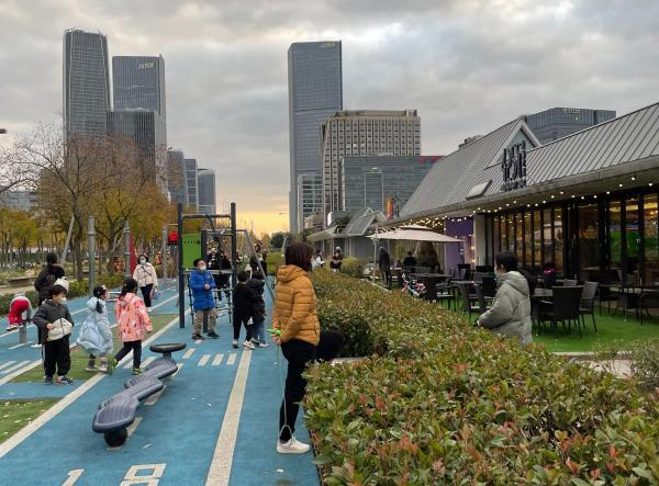 2022年11月25日,徐汇跑道公园·活动之家,交谈的母亲、玩耍的孩子和来往行人组成了一幅热闹场景。澎湃研究所研究员 吕正音 图