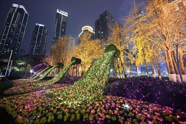 景区里灯火辉煌,两江汇游轮如织,马路上彩灯高挂,楼宇上流光溢彩……