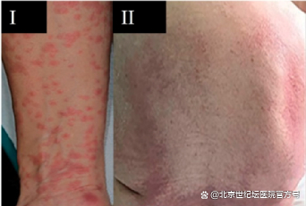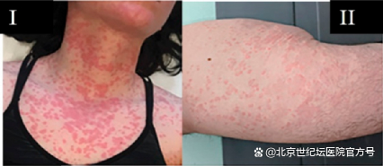 荨麻疹也是新冠病毒感染最常见的皮肤表现之一。通常表现为风团或血管性水肿,可表现为红斑性皮疹,并伴有强烈的瘙痒感。这些病变通常分布在躯干或四肢,在某些情况下也可遍及整个身体或局限于面部。荨麻疹常与新冠病毒感染的其他全身症状同时发生。许多荨麻疹的发生与治疗中的药物过敏反应有关,如抗病毒药物、糖皮质激素、巴瑞替尼等药物都可出现荨麻疹相关副作用。此外,导致荨麻疹的病因也可能是“细胞因子风暴”或病毒对皮肤的直接影响。