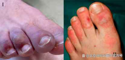 冻疮样病变通常被认为是由暴露于寒冷环境所引起的,表现为手指和/或脚趾肿胀、红斑和青紫等。冻疮样病变也可发生在新冠病毒感染过程的后期,更常见于儿童和年轻人,其持续时间比红斑丘疹更长(平均约一两周),通常出现在无症状感染者或轻症患者中。冻疮样病变的确切机制尚不完全清楚,可能涉及宿主病毒反应、血管炎、血管血栓形成或新生血管生成等。