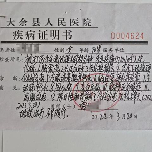大余县人民医院疾病证明书显示,陈女士被打伤多处,意识模糊数分钟,多处疼痛约10小时入院。诊断结果为脑震荡、头皮血肿、多处挫裂伤、皮层下动脉硬化性脑病等12条疾病。