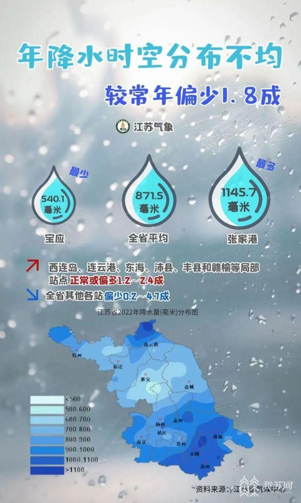 2022年江苏省年降水量偏少,降水时空分布不均,其中春季正常偏少,秋季降水偏多,冬、夏季和12月偏少。