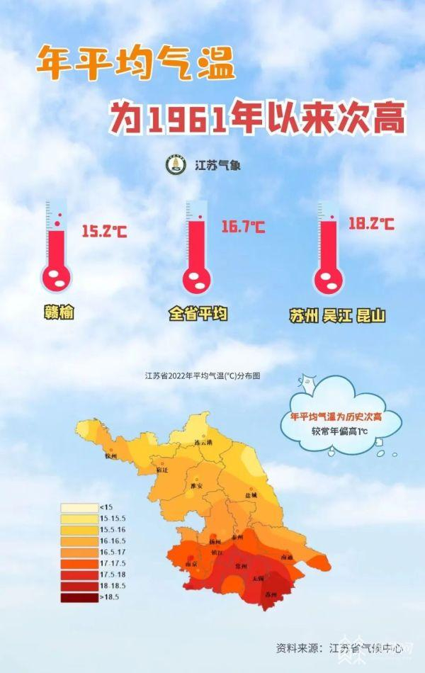 2022年江苏省年平均气温为1961年以来次高。全省各站平均气温15.2℃(赣榆)~18.2℃(苏州、昆山、吴江),全省平均气温16.7℃,为历史次高(仅低于2021年16.8℃),较常年偏高1℃。