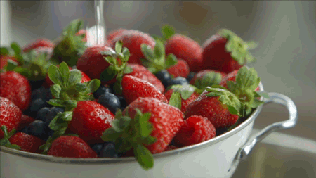 先用清水把整颗草莓冲洗干净,再去除草莓蒂。如果还是担心不够干净,还可以用淡盐水浸泡草莓5分钟。