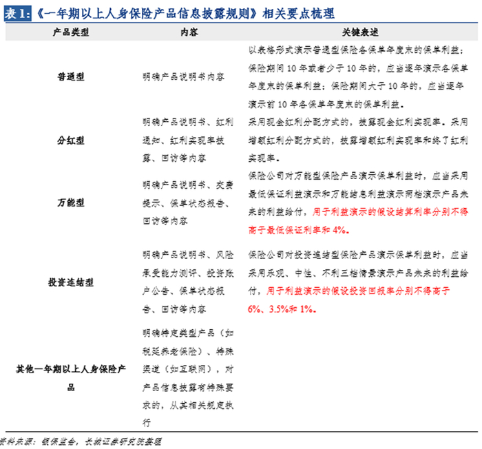 《规则》全面下调演示利率水平,分红保险中用于利益演示的利差水平分别不得高于0、4.5%减去产品预定利率;万能险中用于利益演示的假设结算利率分别不得高于最低保证利率和4%;投连险中需采用乐观、中性、不利三档情景演示产品未来的利益给付,演示利率从7%、4.5%、1%下调至6%、3.5%、1%。降低演示利率上限有利于让保险公司将自身产品的演示利益控制在合理水平,更加具备现实性,进一步规范营销实践。演示利率上限与市场利率长期走低的趋势保持一致,有利于引导保险公司关注自身利差损风险。