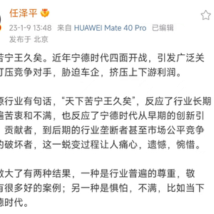 对此,任泽平自身在文中给出的解释是,在大国博弈和逆全球化的严峻形势下,希望龙头企业担当起中国新能源换道超车的重任,千万不要陷入到“内战内行、外战外行”的陷阱,能够团结一致,共同撑起行业使命。希望宁德时代能够在未来担当行业创新的引领者、行业生态的重要维护者、行业价值观的敬畏者,而不是市场生态的破坏者,引发众怨,众叛亲离,规模越大,责任越大,行业龙头企业应该承担更多的社会责任。