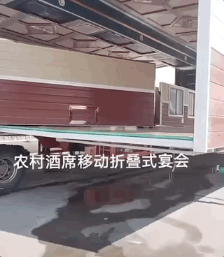 在当地,购买改装大卡车的主力军是农村大席的操办者,所以你会看到行驶的时候是平时常见的大卡车形态,一但车停下来展开就成了有门窗的酒楼。