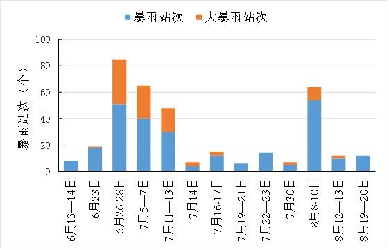 夏季全省平均降水量为623.2毫米,较常年偏多48.9%,为1951年以来历史同期第3位多值。区域性暴雨过程多达13次,全省平均暴雨日数为3.4天,较常年偏多1.4天,为1965年以来最多,25站日降水量突破历史同期极值。