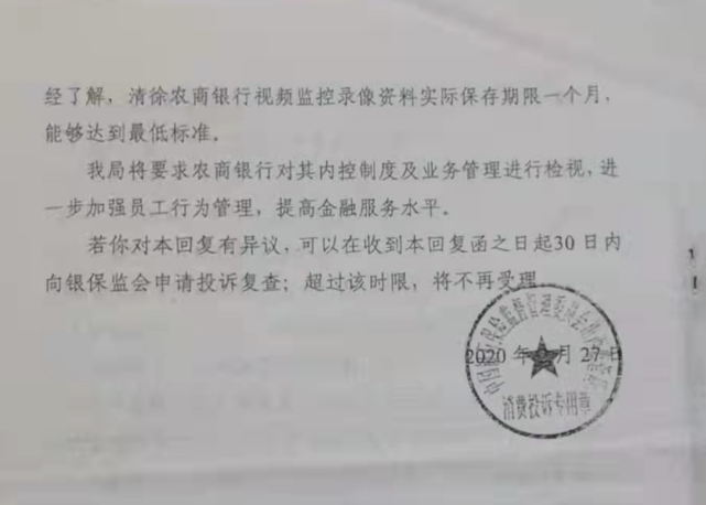 其提供的一份资料显示,2020年2月,一份落章为中国银行保险监督管理委员会山西监管局的文件回复称:我局将要求农商银行对其内控制度及业务管理进行检视,进一步加强员工行为管理,提高金融服务水平。