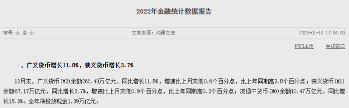 2022年12月末,广义货币(M2)余额为266.43万亿元,同比增长11.8%,增速比上月末低0.6个百分点,比上年同期高2.8个百分点。