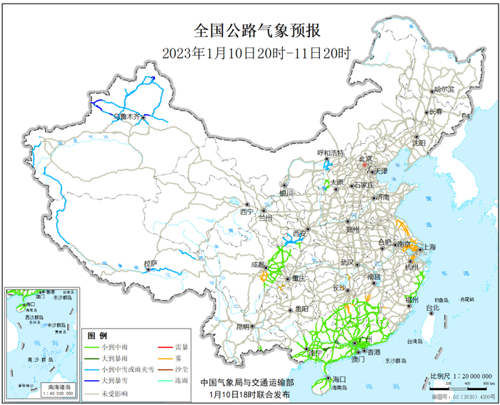 1月10日20时至11日20时,新疆北部和西部山区、内蒙古东北部、黑龙江西北部、西藏西部和东部、陕西西南部等地部分地区有小到中雪或雨夹雪,其中,新疆北疆北部、伊犁河谷、南疆西部山区、西藏西部等地局地有大到暴雪。江南南部、华南大部、四川东部等地部分地区有小到中雨,局地有大雨。另外,江苏东部、浙江北部、江西中部、湖南东南部、四川东南部等地局地有雾。